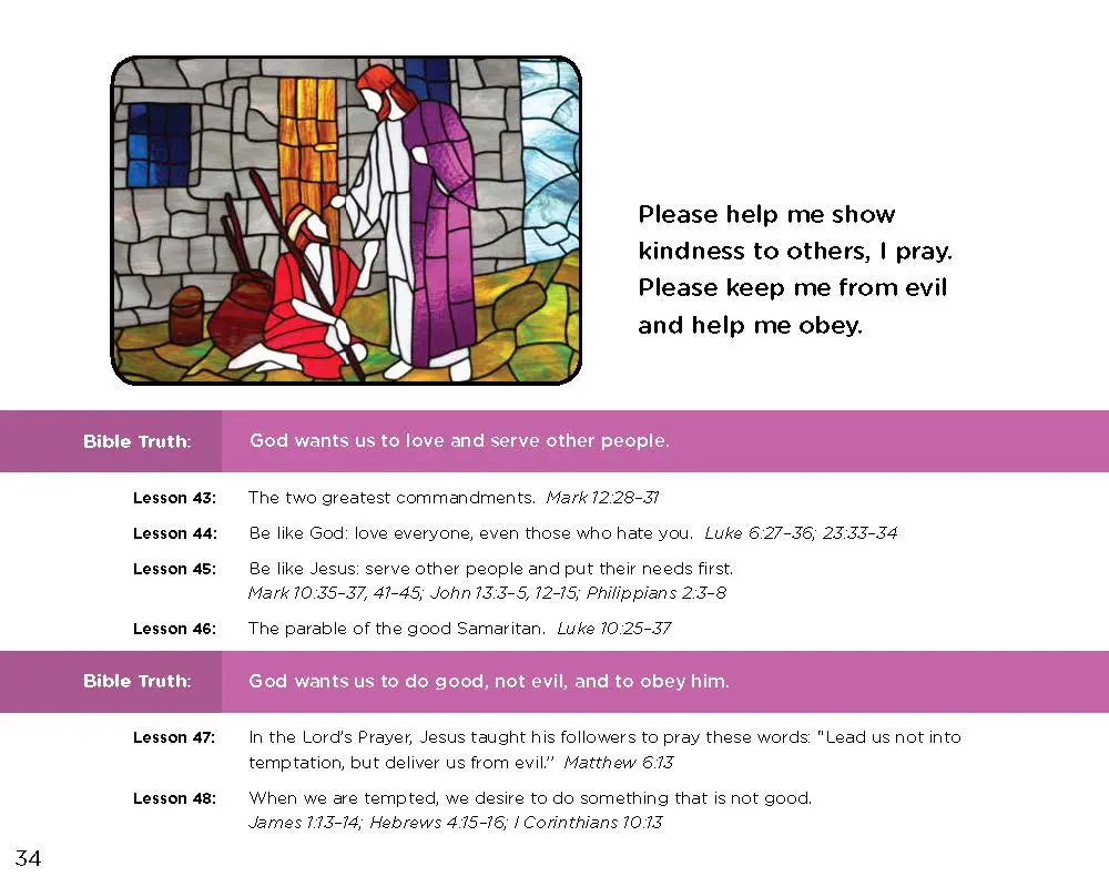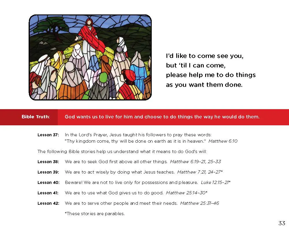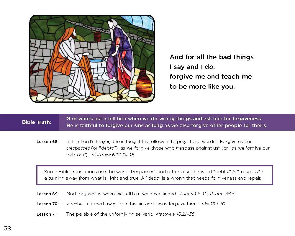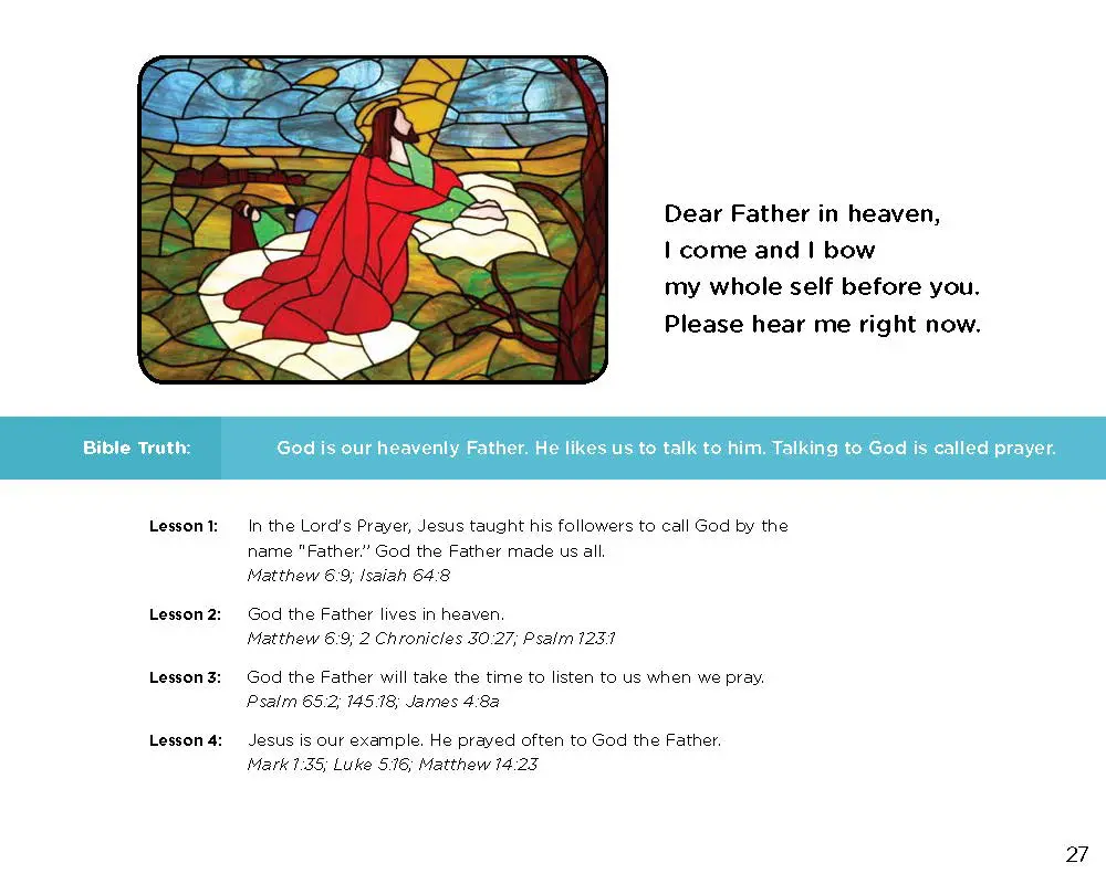 The back of the book includes an easy to follow learning guide for parents that includes: Bible passages, summaries of each verse or passage, definitions, instructions for use, and child-friendly stained glass windows as illustrations. As an extra bonus, the book ends with a list of all the known prayers of Jesus.